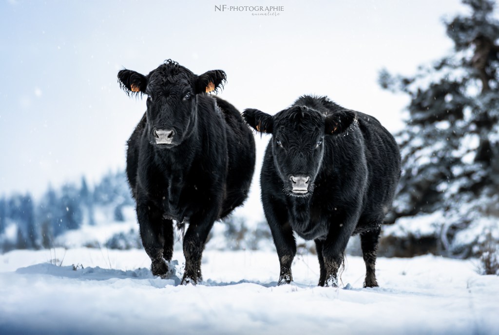 Les vaches Angus sont élevées en plein air pour profiter des pâturages la majeure partie de l’année. Durant l’hiver, elles sont présentes dans des bâtiments conçus pour leur confort et leur sécurité. Ces abris, spacieux et bien ventilés, leur permettent de se protéger des intempéries, tout en conservant un espace suffisant pour se mouvoir librement. Cette gestion hivernale leur garantit une alimentation équilibrée, composée de foin et de céréales produits sur l’exploitation.
